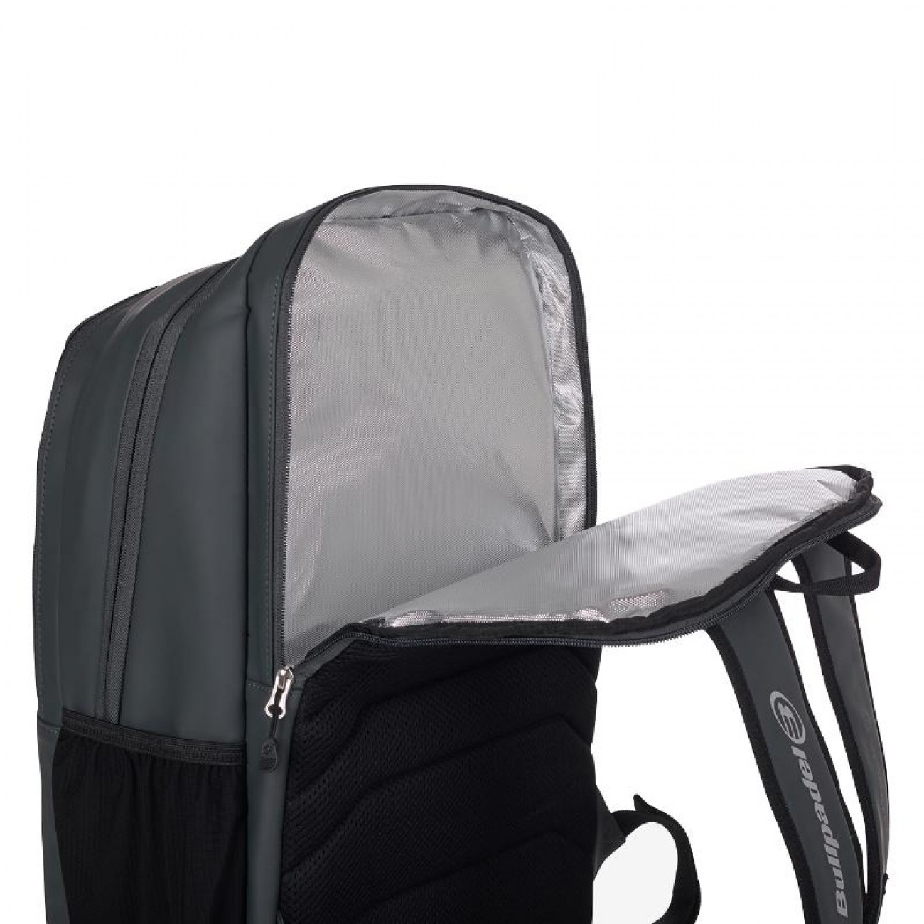 Diseño ergonómico con espaldera de foam ventilado, correa pectoral ajustable y bolsillo lateral porta-pelotas.