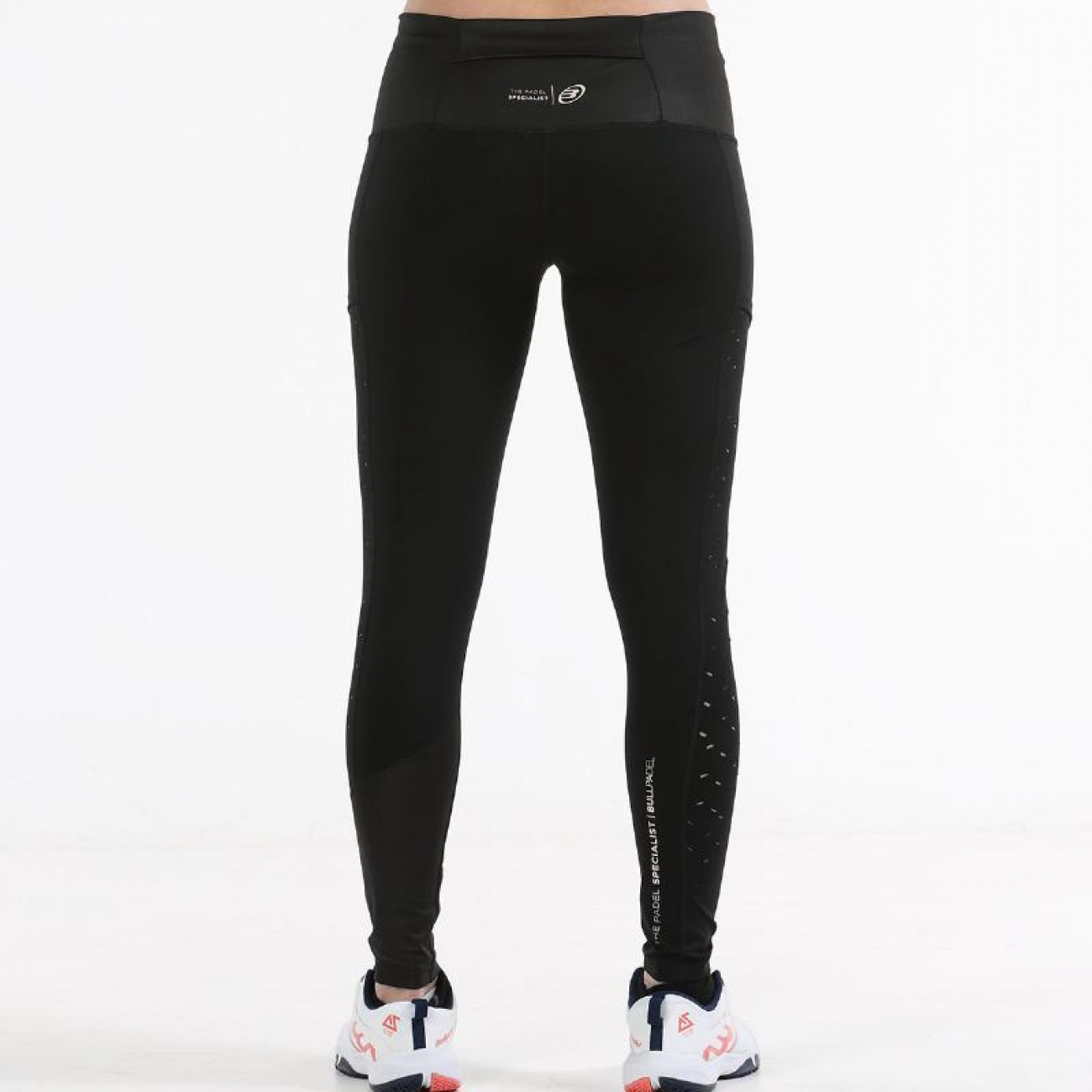 Malha de padel longa para mulheres da linha Purecolor Bullpadel Mod. Poeta em preto, atual e moderno feito com tecidos ultraleves de alta qualidade. Ele incorpora bolsos laterais para celular e bola, e bolso envolvente na parte de tras da cintura.
