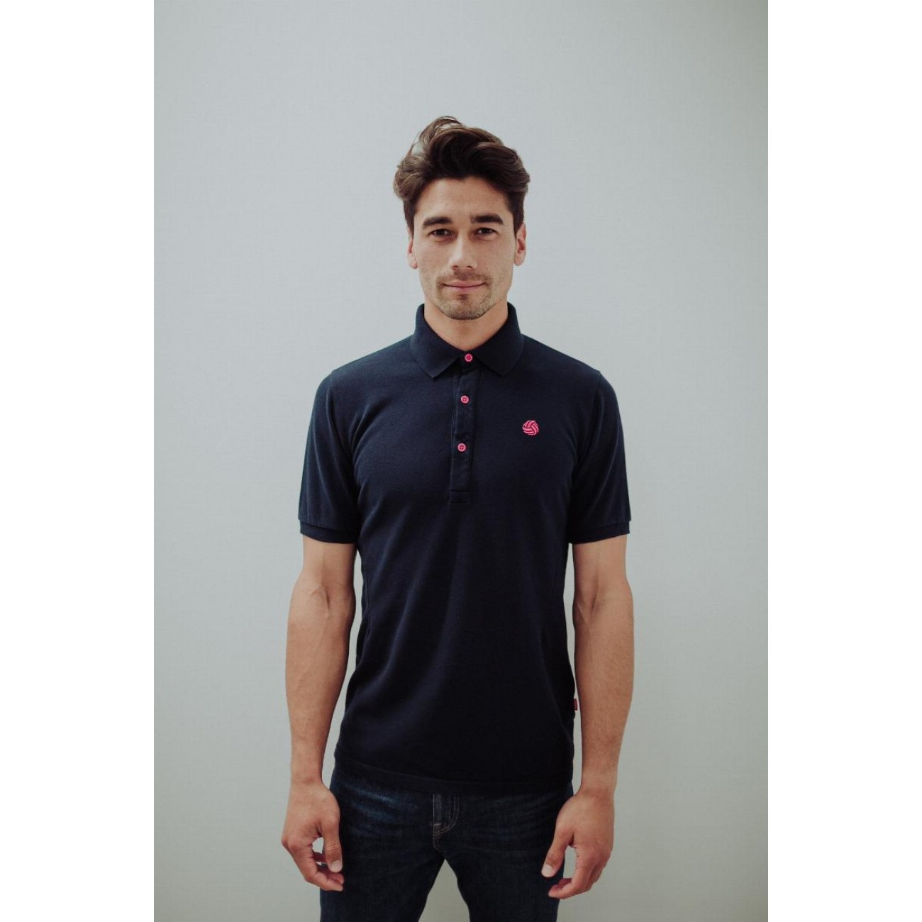 Logo bordado en rosa fucsia.